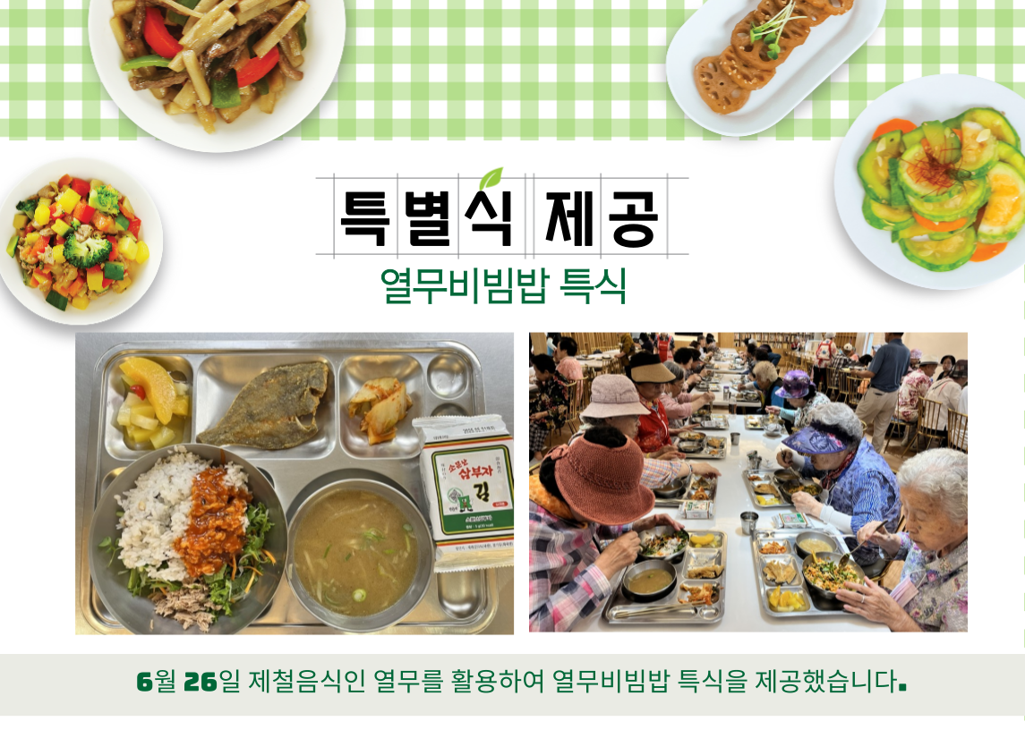경로식당사업 특별식 제공 페이지 정보 작성자 복지관 작성일24-07-04 08:36 조회수312 본문 6월 26일 제철음식인 열무를 활용하여 열무비빔밥 특식을 제공했습니다. 목록 답변 이전글 경로당여가문화보급사업 안마서비스 24.07.04 다음글 경로식당사업 특별식 제공 24.07.04