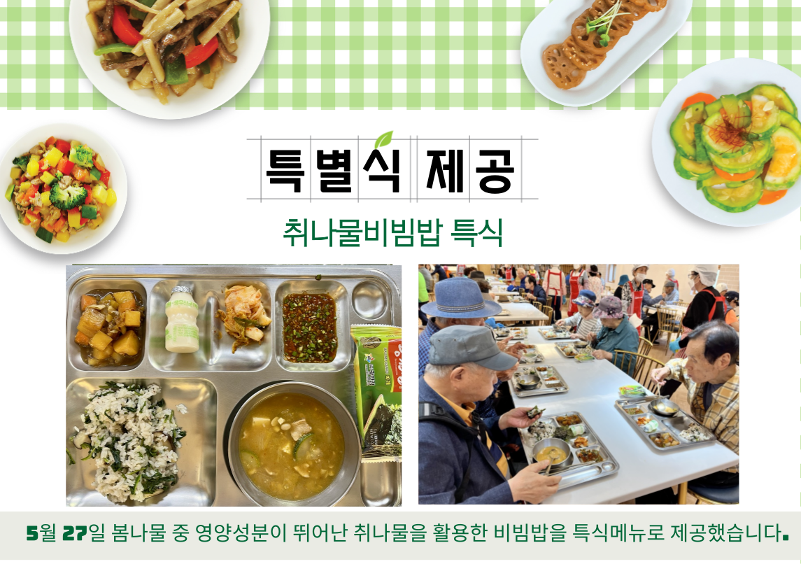 경로식당사업 특별식 제공 페이지 정보 작성자 복지관 작성일24-06-03 09:35 조회수345 본문 5월 27일 봄나물 중 영양성분이 뛰어난 취나물을 활용한 비빔밥을 특식메뉴로 제공했습니다. 목록 답변 이전글 경로당여가문화보급사업 치매예방교실 24.06.03 다음글 경로식당사업 특별식 제공 24.06.03
