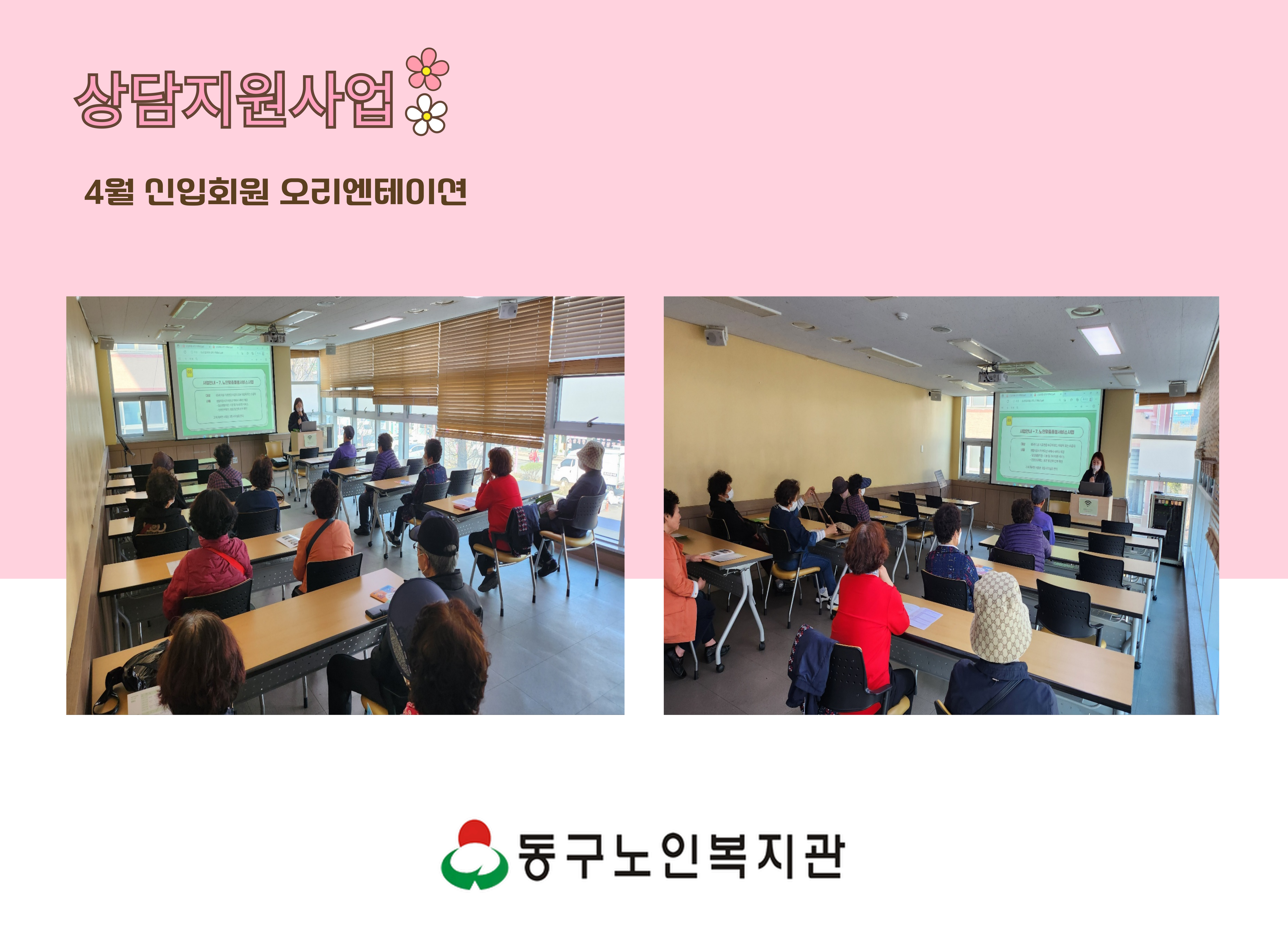 상담지원사업 4월 신입회원 오리엔테이션 페이지 정보 작성자 복지관 작성일24-04-08 16:08 조회수283 본문 상담지원사업에서는 4월 신입회원들을 대상으로 복지관 사업 및 안내를 위한 오리엔테이션을 진행하였습니다. 목록 답변 이전글 응급안전안심서비스사업 현장컨설팅 진행 24.04.08 다음글 경로당여가문화보급사업 가요교실 24.04.05