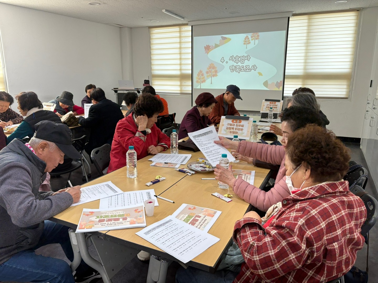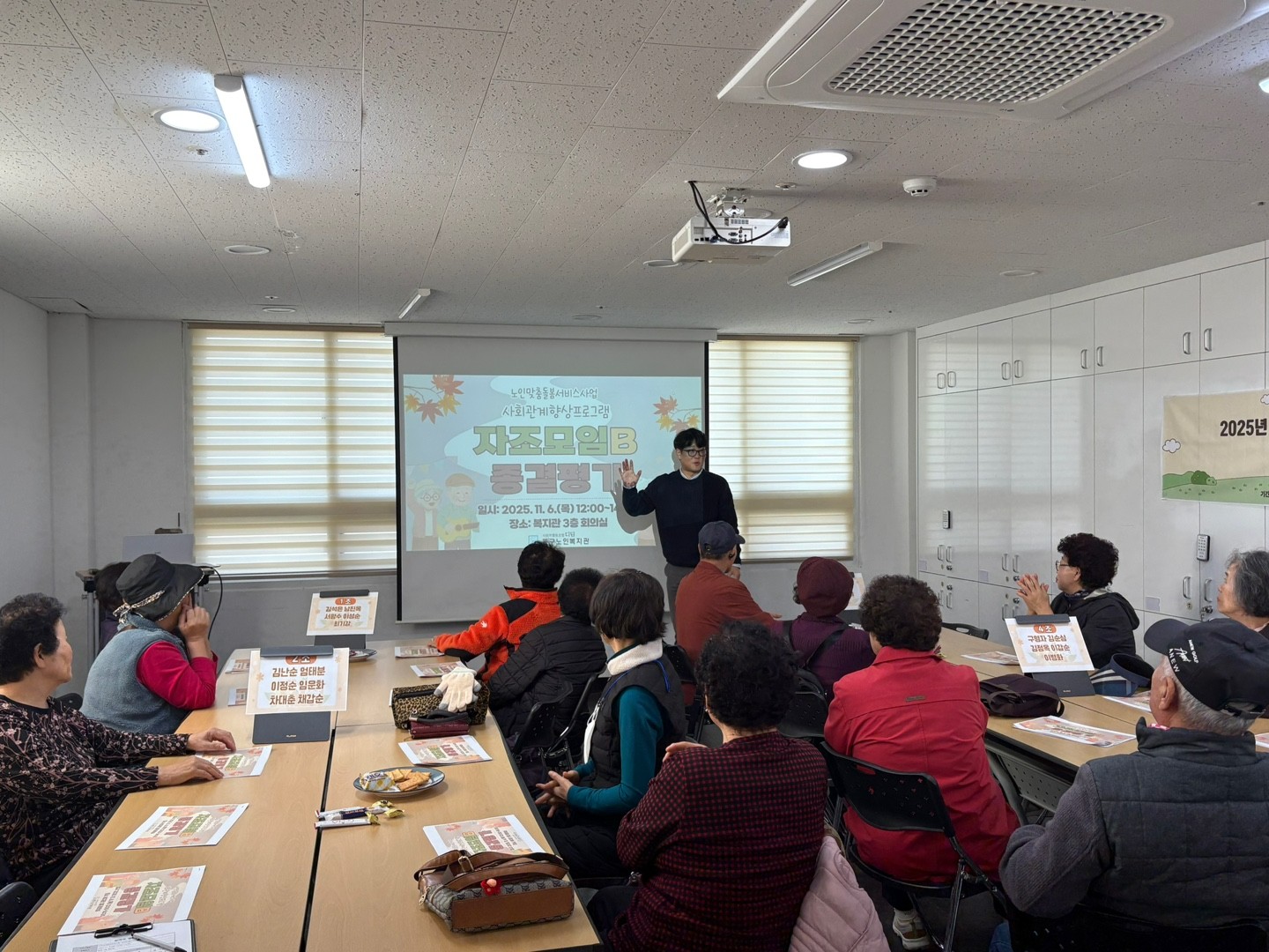 복지관 3층 회의실에서 ‘자조모임B’ 참여 어르신들과 함께 6회기 종결평가 및 소규모 파티를 진행했습니다.