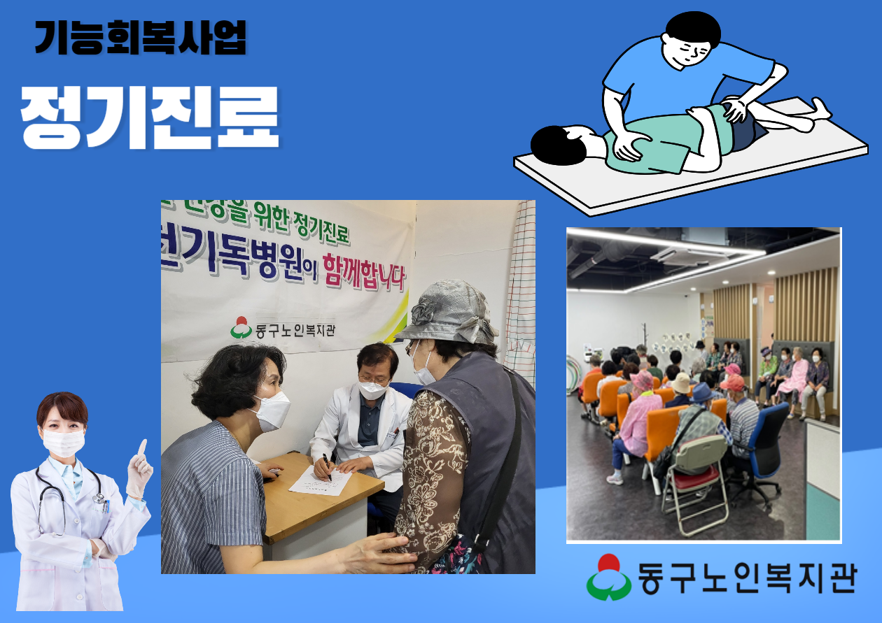 기능회복사업 정기진료 페이지 정보 작성자 복지관 작성일23-10-11 20:50 조회수319 본문 1. 사업명 : 정기진료 및 의료상담2. 일시 : 매월 둘째주 금요일 10시 40분3. 내용 : 신체적으로 기능이 저하된 어르신들을 대상으로 의료서비스를 제공 목록 답변 이전글 기능회복 혈압체크 23.10.11 다음글 경로식당 안전보건교육 23.10.11