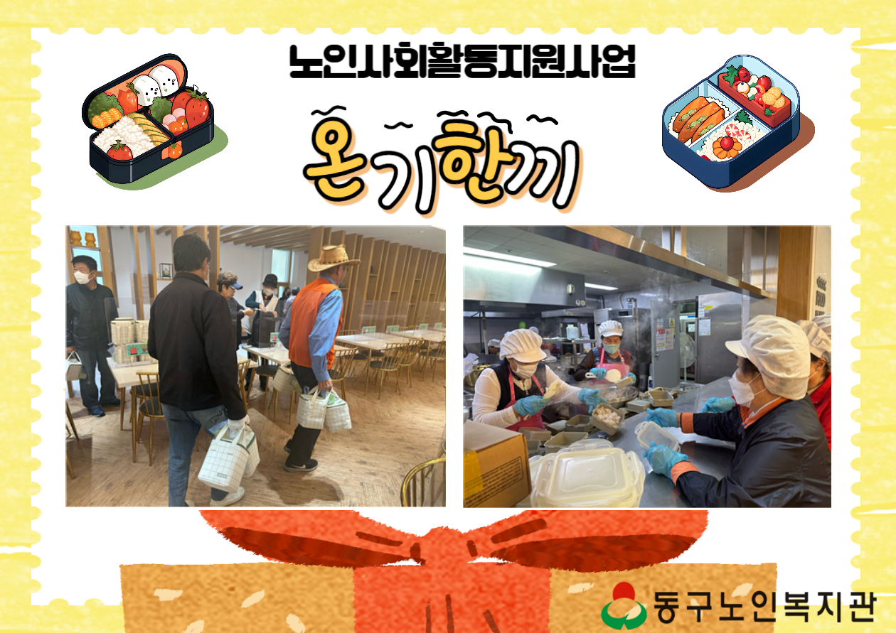 노인사회활동지원사업 온기한끼사업단(도시락배달) 페이지 정보 작성자 복지관 작성일23-10-12 13:48 조회수343 본문 1.사업명: 노인사회활동지원사업 온기한끼(도시락배달)2.활동시간: 월 10회, 일 3시간 활동3.내용: 도시락 포장 및 어르신 가정에 배달 목록 답변 이전글 노인사회활동지원사업 동행+(건강지킴이) 23.10.12 다음글 노인사회활동지원사업 복지시설길라잡이(환경클리너) 23.10.12