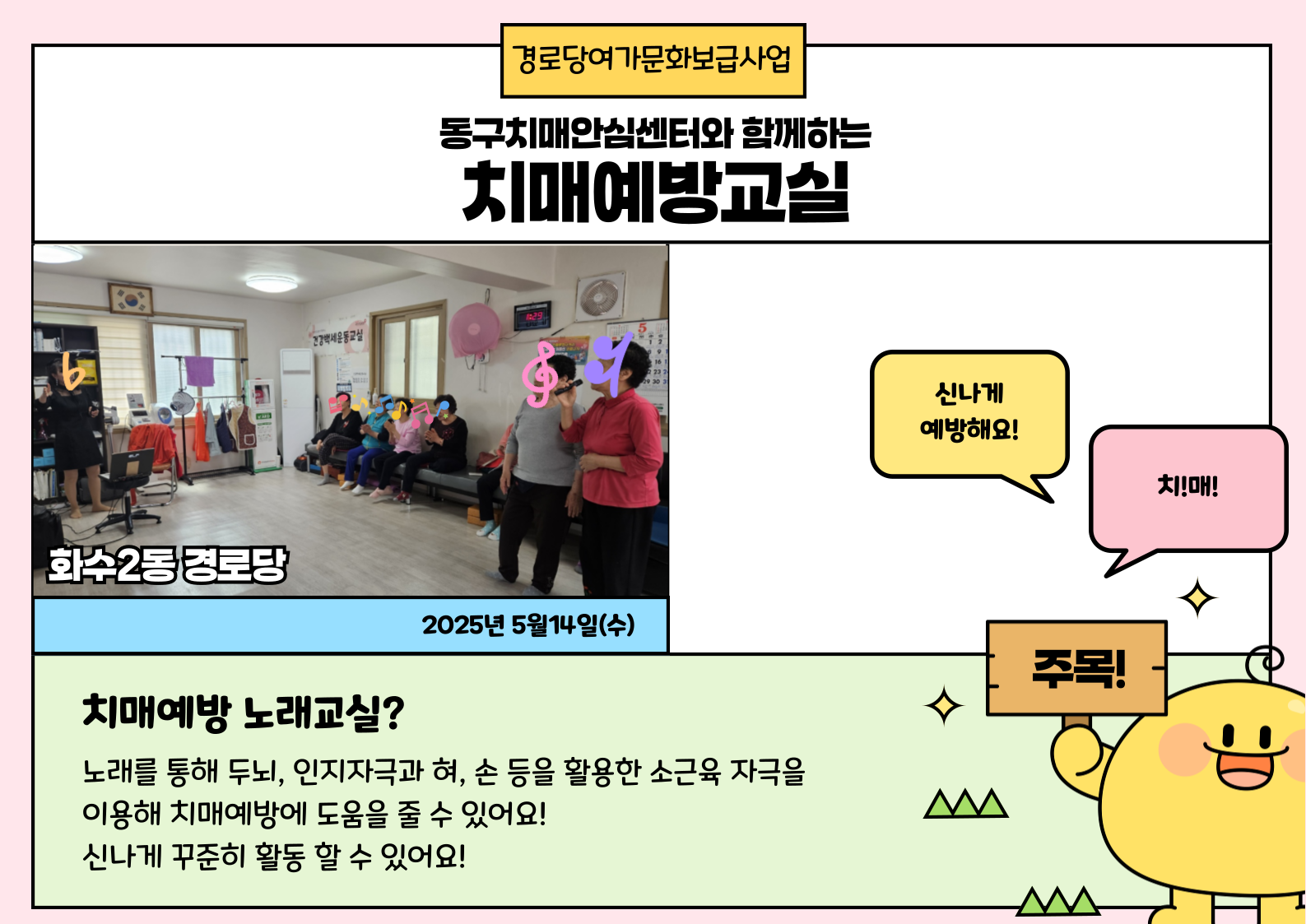 지난 5월 14일 수요일 동구치매안심센터와 함께하는 치매예방교실이 진행되었습니다!