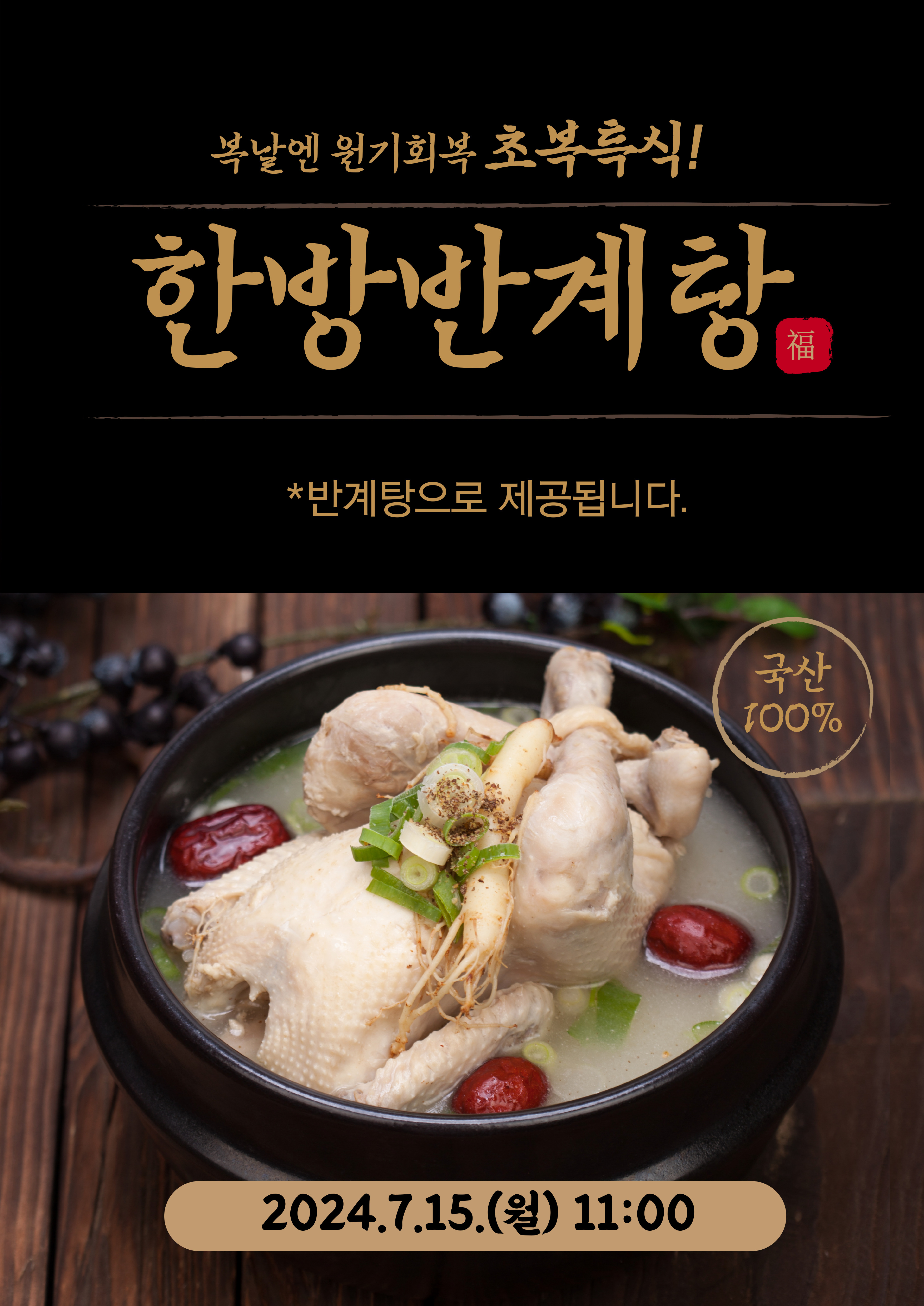 경로식당사업 7월 한방반계탕 특식 페이지 정보 작성자 복지관 작성일24-07-08 09:46 조회수333 본문 동구노인복지관 경로식당사업에서는 무료급식 및 실비급식을 이용하시는 어르신들에게 초복특식으로 한방반계탕 메뉴를 준비했습니다. 목록 답변 이전글 경로식당사업 7월 한방보쌈 특식 24.07.08 다음글 경로식당사업 7월 짜장면 특식 24.07.08