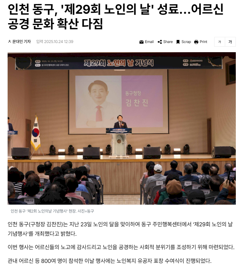 인천 동구, '제29회 노인의 날' 성료…어르신 공경 문화 확산 다짐 페이지 정보 작성일25.11.10 보도일자 2025.10.24 언론사명 글로벌경제신문 외 6건 본문 관련링크 https://www.getnews.co.kr/news/articleView.html?idxno=845893 목록 답변 이전글 동구노인복지관, '교통안전 베테랑 교실' 캠페인 25.12.10 다음글 인천 동구노인복지관, 세대 간 소통 프로그램 운영 25.11.10