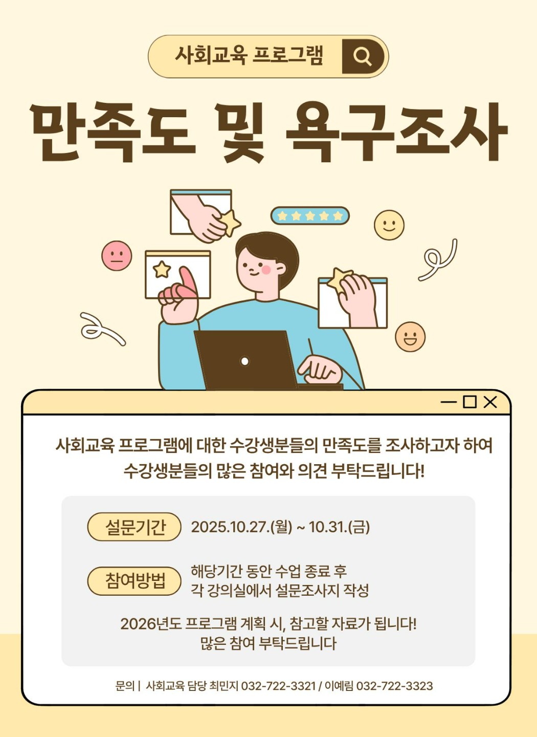 사회교육 만족도 및 욕구조사 진행 페이지 정보 작성일25.11.10 본문 사회교육사업 만족도 및 욕구조사 홍보지 목록 답변 이전글 사회교육사업 열린교실 한마당 진행 25.11.10 다음글 홈페이지 리뉴얼 오픈 25.10.28