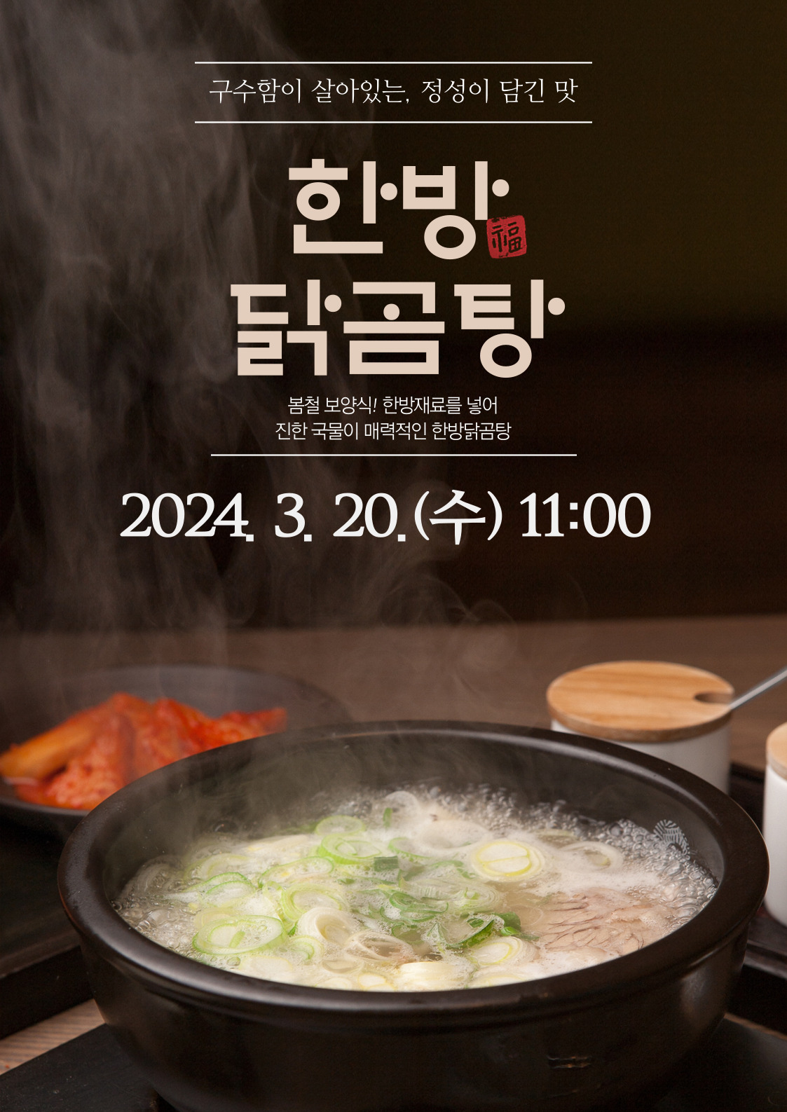경로식당 3월 닭곰탕 특식 행사 페이지 정보 작성자 복지관 작성일24-03-07 16:36 조회수284 본문 동구노인복지관 경로식당사업에서는 무료급식 및 실비급식을 이용하시는 어르신들에게 환절기 건강증진을 위해 한방재료가 첨가된 닭곰탕특식을 준비했습니다. 목록 답변 이전글 경로식당 3월 소고기국밥 특식 행사 24.03.07 다음글 경로식당 3월 우동특식 행사 24.03.07