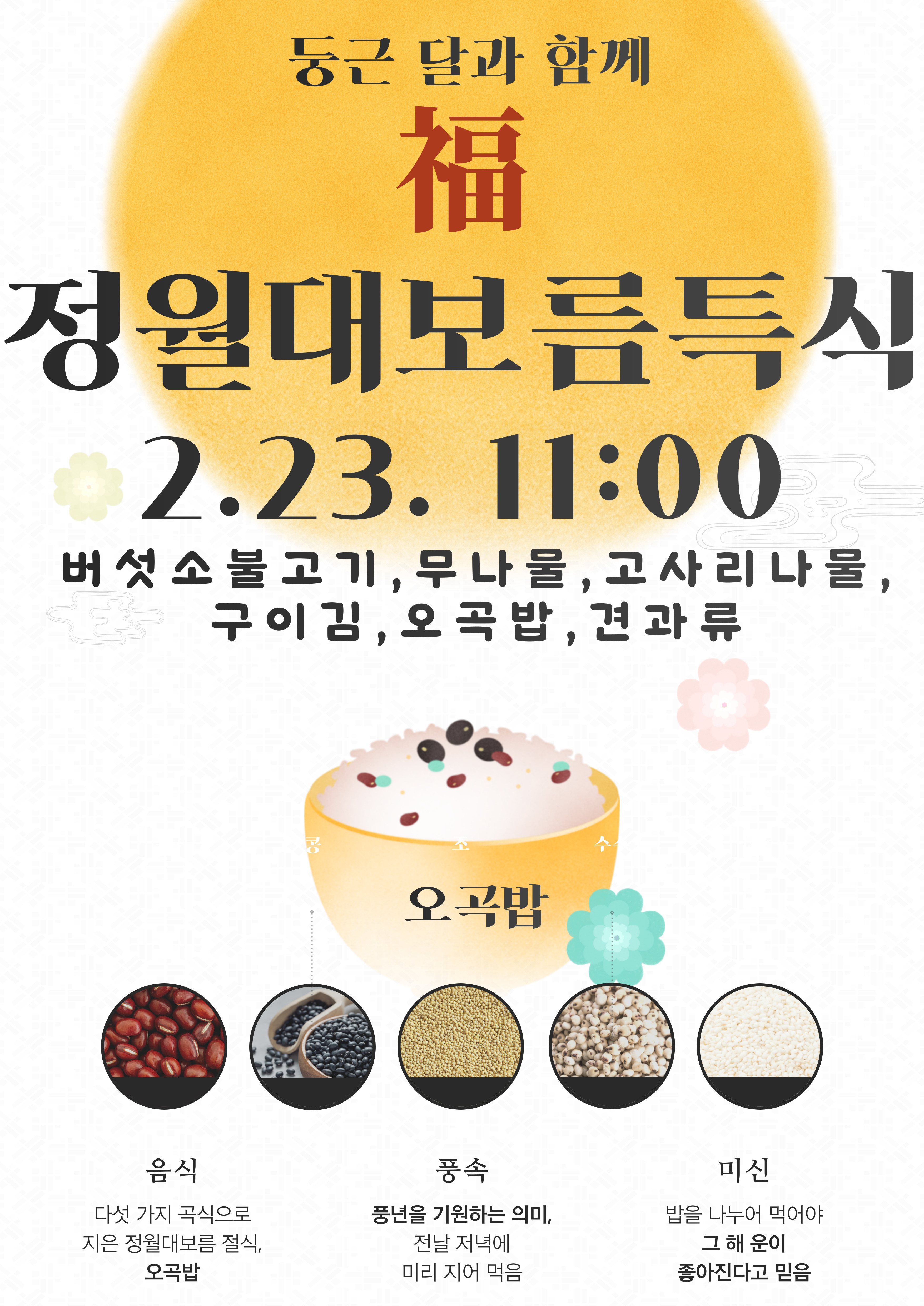 경로식당 2월 정월대보름특식 행사 페이지 정보 작성자 복지관 작성일24-02-07 08:57 조회수284 본문 동구노인복지관 경로식당사업에서는 무료급식 및 실비급식을 이용하시는 어르신들에게 정월대보름을 맞이하여 오곡밥과 견과류, 나물류 및 불고기를 준비했습니다. 목록 답변 이전글 경로식당 2월 중식특식 행사 24.02.07 다음글 경로식당 2월 국수특식 행사 24.02.07