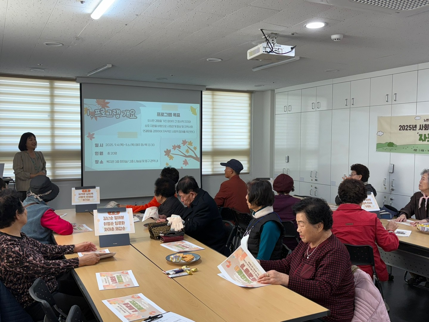 복지관 3층 회의실에서 ‘자조모임B’ 참여 어르신들과 함께 6회기 종결평가 및 소규모 파티를 진행했습니다.
