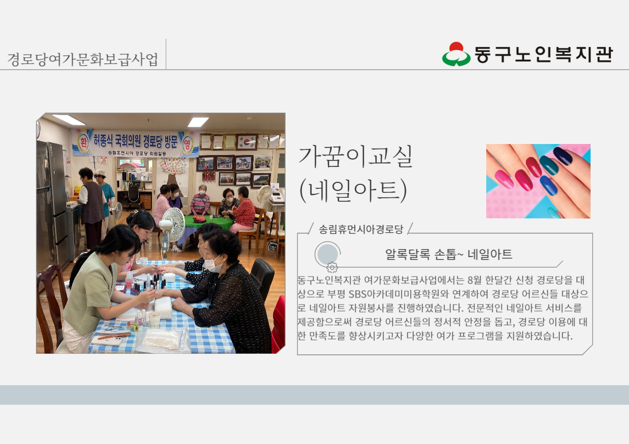 경로당여가문화보급사업 가꿈이교실(네일아트) 페이지 정보 작성자 복지관 작성일23-10-06 15:27 조회수304 본문 경로당여가문화보급사업 가꿈이교실(네일아트) 목록 답변 이전글 경로당여가문화보급사업 평가운영위원회 23.10.06 다음글 개방형 경로당 (공예교실) 23.10.06