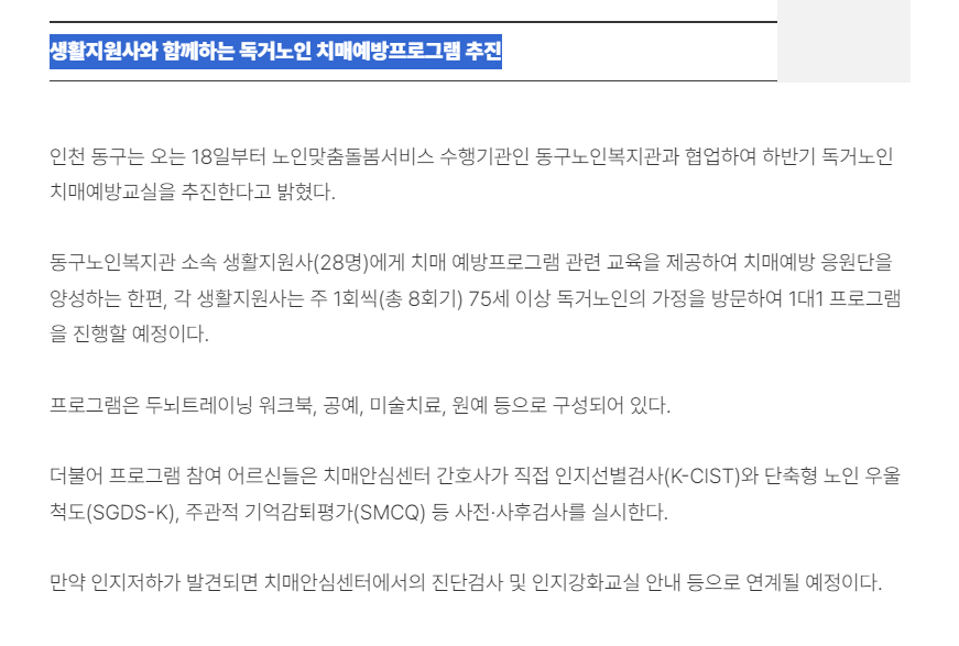 - 이전글 [ 기호일보 ] 인천시 동구, ‘하반기 독거노인 치매 예방교실’ 추진 23.10.12