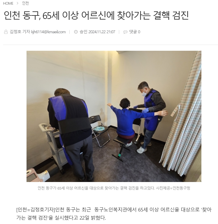 인천 동구, 65세 이상 어르신에 찾아가는 결핵 검진 페이지 정보 작성일25.03.11 보도일자 언론사명 본문 ● 발행처 : 경인매일 ● 발행일자 : 2024.11.22● 기사원문 : 상단 링크 확인 관련링크 https://www.kmaeil.com/news/articleView.html?idxno=481814 목록 답변 이전글 2024 사회교육사업 성과발표회 성황리에 마무리 25.03.12 다음글 동구노인복지관 위탁계약증서 전달 24.08.14