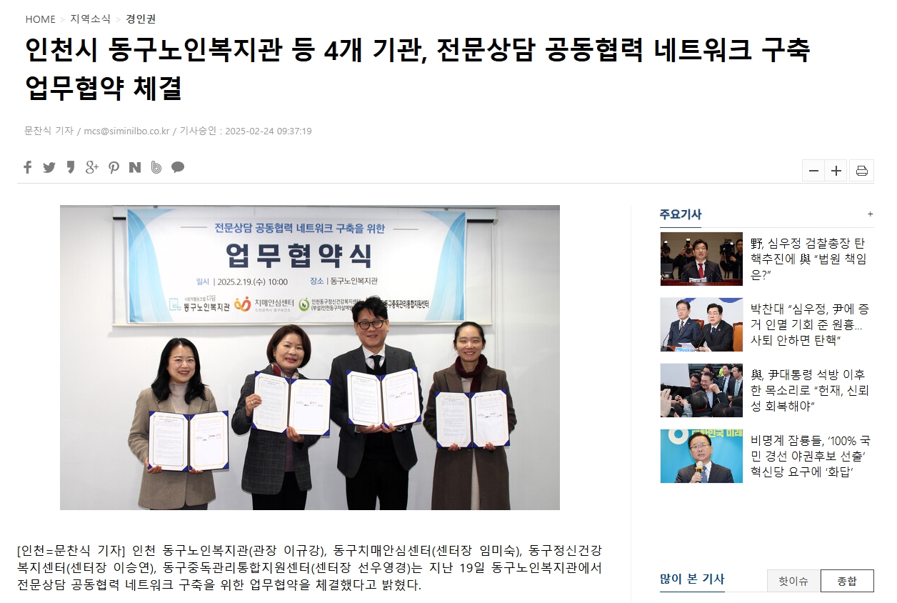 전문상담 공동협력 네트워크 구축 업무협약 체결 페이지 정보 작성일25.03.12 보도일자 언론사명 본문 ● 발행처 : 시민일보● 발행일자 : 2025.02.24● 기사원문 : 상단 링크 확인 관련링크 https://www.siminilbo.co.kr/news/newsview.php?ncode=1160284108230632 목록 답변 이전글 인천광역시의료원 동구 노인 건강증진향상 네트워크 구축 25.03.12 다음글 인하대병원과 심뇌혈관질환 예방 교육 협력 25.03.12