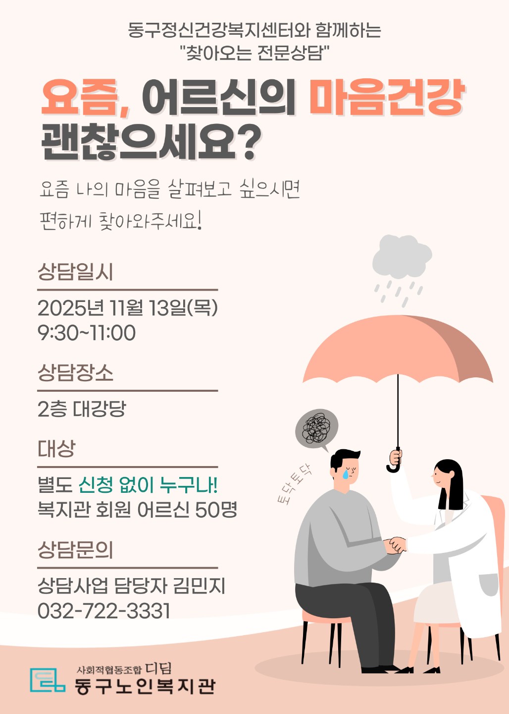 찾아가는 전문상담(정신건강) 진행 페이지 정보 작성일25.11.10 본문 상담지원사업 찾아가는 전문상담(정신건강) 진행 목록 답변 이전글 4분기 전문법률상담 진행 25.11.11 다음글 사회교육사업 열린교실 한마당 진행 25.11.10