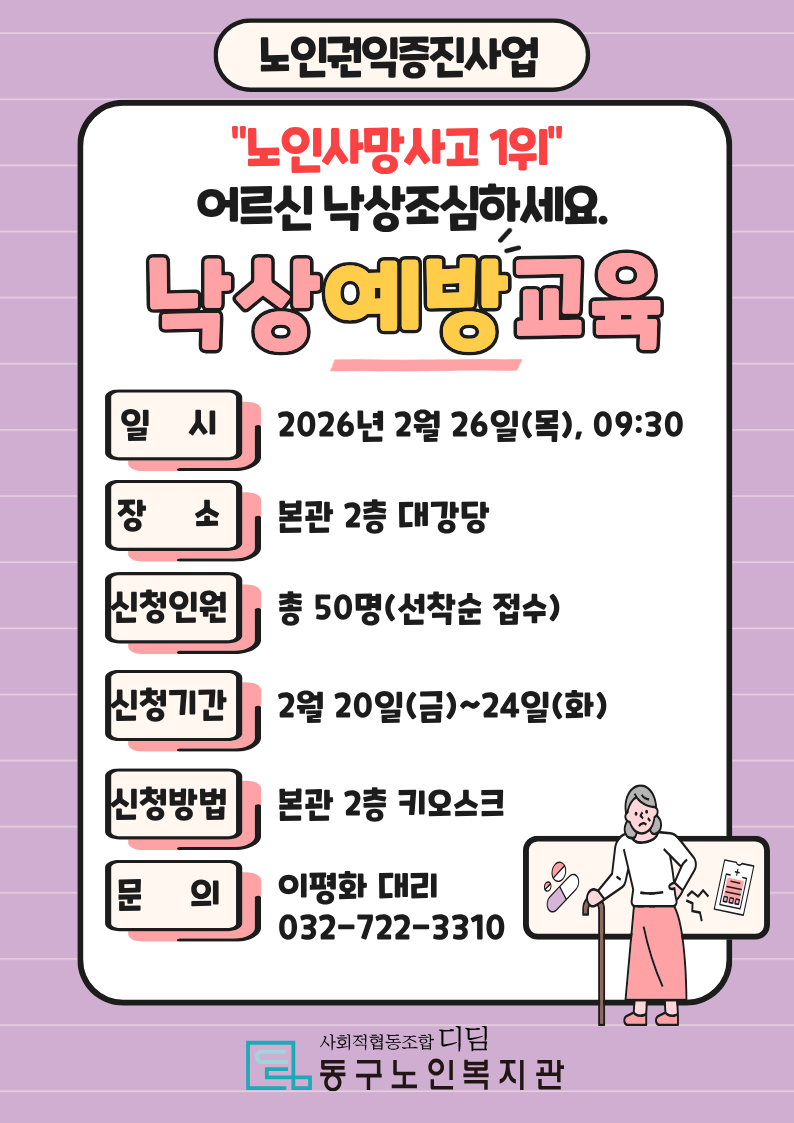 노인권익증진사업 낙상예방교육 실시 페이지 정보 작성일26.02.20 본문 목록 답변 이전글 치매예방서포터즈 전문교육 인원 모집 26.02.26 다음글 가족기능사업 1인가구 행복 동행사업(행복한 건강밥상) 프로그램 실시 26.02.20