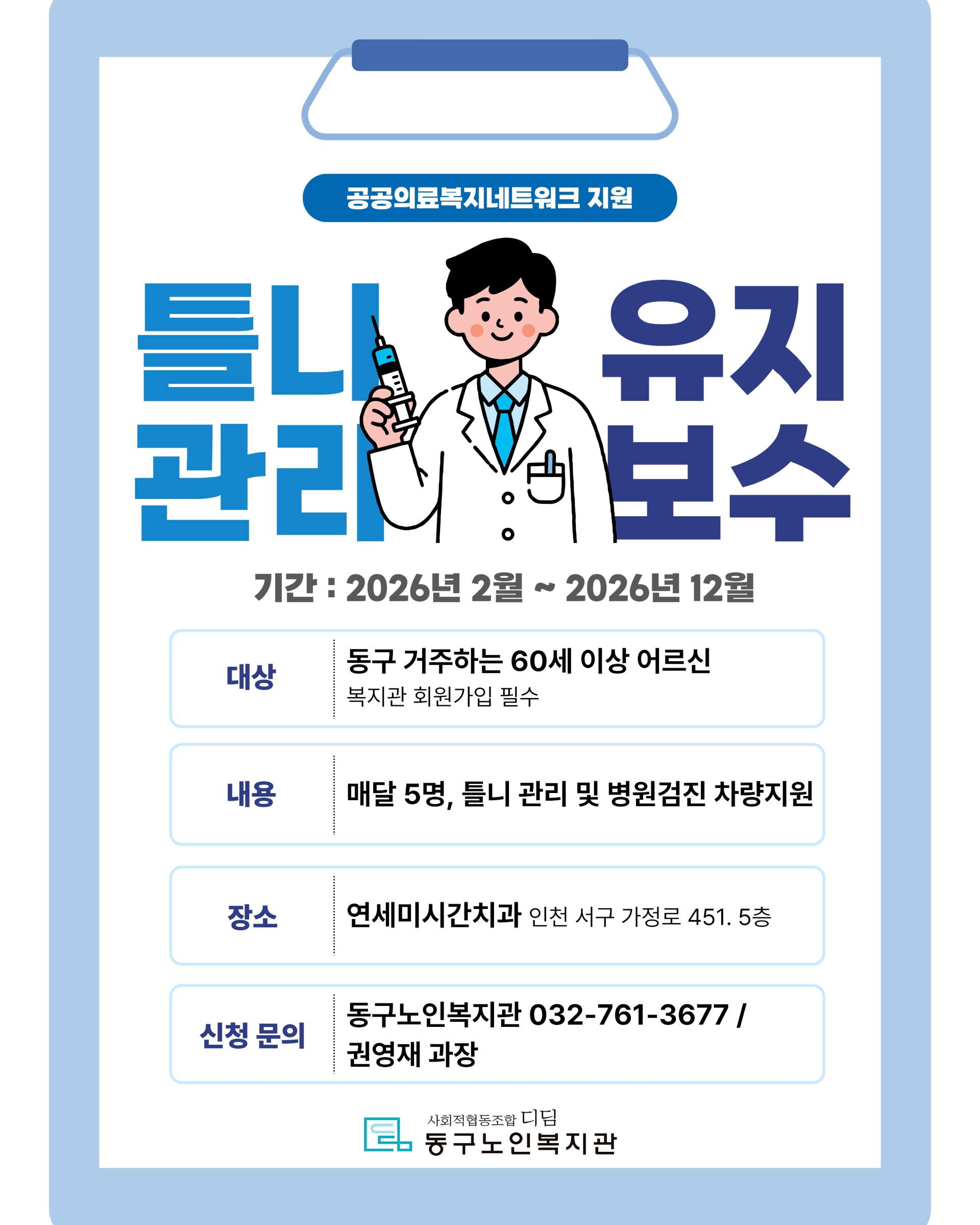 틀니관리 및 유지보수 대상자 모집 페이지 정보 작성일26.02.26 본문 목록 답변 이전글 노인권익증진사업 노인인권교육 실시 26.03.05 다음글 치매예방서포터즈 전문교육 인원 모집 26.02.26